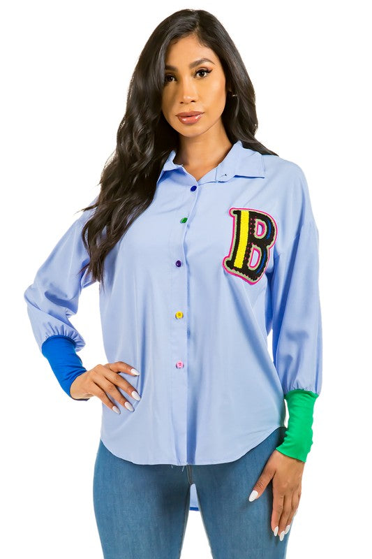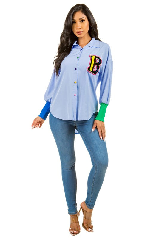 Sexy fashion top shirt, long sleeves, front color button , height low style look