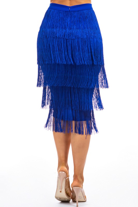 Details-Pencil style max skirt, multi tassels design, back zipper.